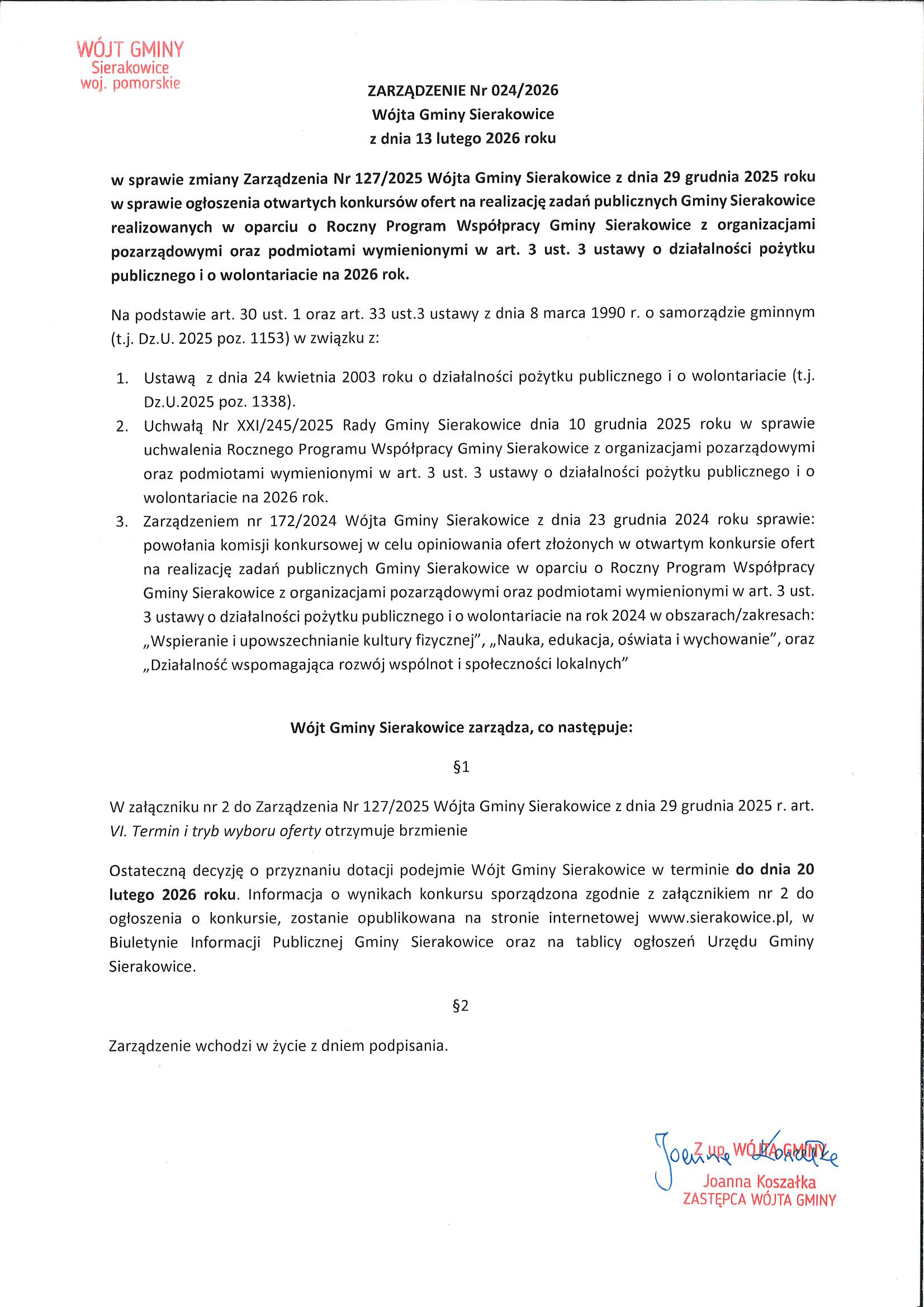 w sprawie zmiany Zarządzenia Nr 127/2025 Wójta Gminy Sierakowice z dnia 29 grudnia 2025 roku w sprawie ogłoszenia otwartych konkursów ofert na realizację zadań publicznych Gminy Sierakowice realizowanych w oparciu o Roczny Program Współpracy Gminy Sierakowice z organizacjami pozarządowymi oraz podmiotami wymienionymi w art. 3 ust. 3 ustawy o działalności pożytku publicznego i o wolontariacie na 2026 rok.