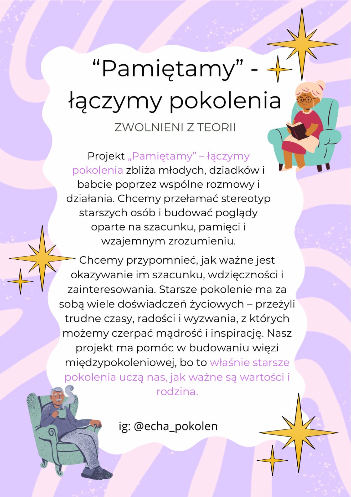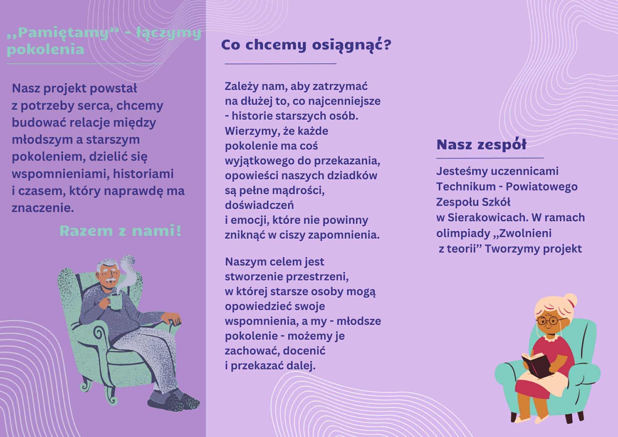 Trzy uczennice klasy 4 TRA Technikum Powiatowego Zespołu Szkół w Sierakowicach realizują projekt społeczny „Pamiętamy – łączymy pokolenia”. Inicjatywa powstała w ramach ogólnopolskiej olimpiady ZWOLNIENI Z TEORII i ma na celu zbliżenie młodego i starszego pokolenia.