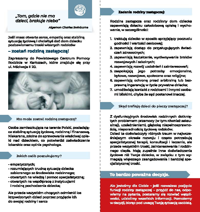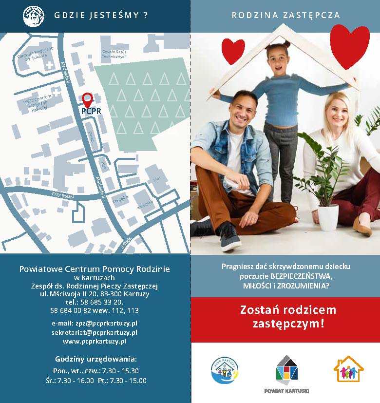 Jeśli masz otwarte serce i chcesz zmienić czyjeś życie – odwiedź PCPR w Kartuzach przy ul. Mściwoja II 20. Otrzymasz wszelkie informacje, odpowiedzi na pytania oraz wsparcie w podjęciu decyzji.