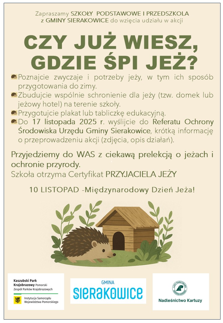 Celem akcji jest zwiększenie świadomości ekologicznej wśród uczniów szkół podstawowych i przedszkoli z terenu Gminy Sierakowice. Stworzenie bezpiecznych miejsc zimowania dla jeży na terenie szkoły, zapewne zachęci dzieci do troski o dzikie zwierzęta w ich otoczeniu.