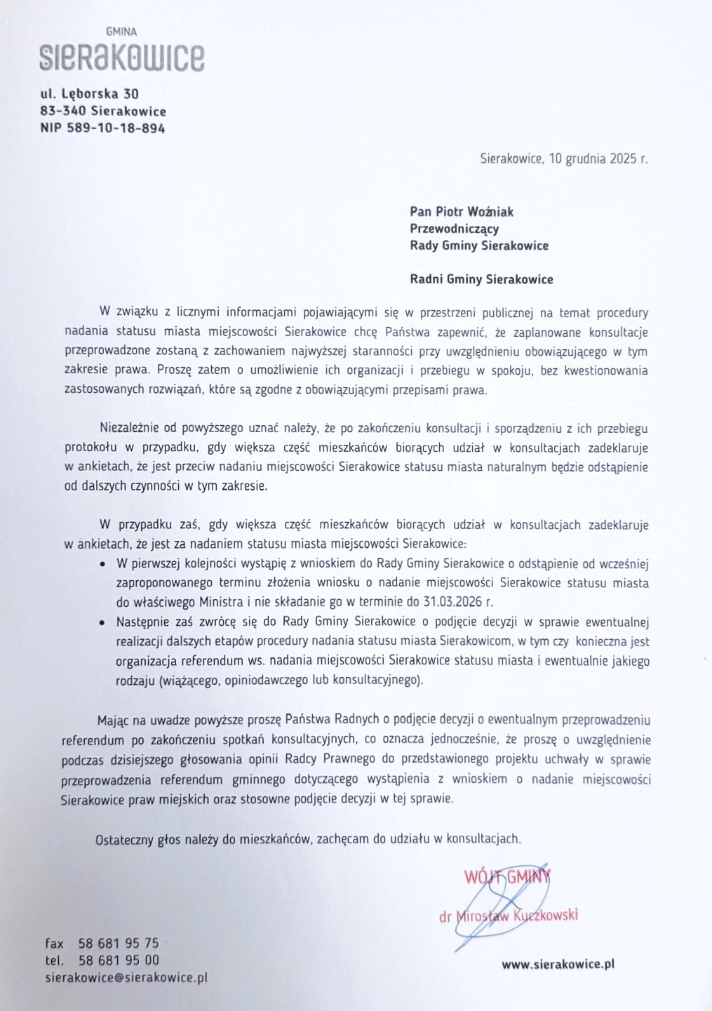 - Zarządzenie Nr 112/2025 Wójta Gminy Sierakowice z dnia 25 listopada 2025r. w sprawie określenia szczegółów organizacyjnych dotyczących konsultacji społecznych z mieszkańcami Gminy Sierakowice w sprawie nadania miejscowości Sierakowice statusu miasta