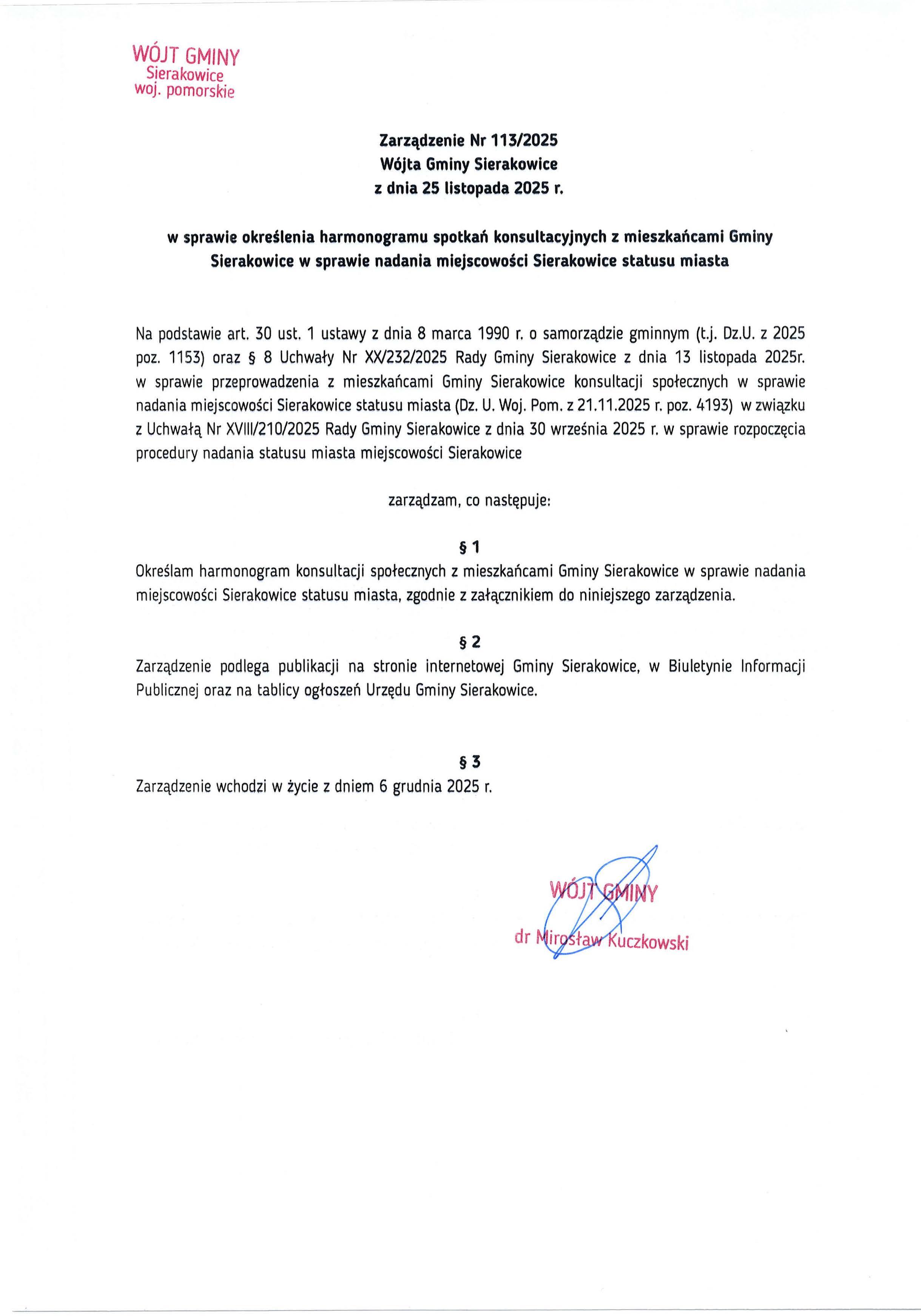 - Zarządzenie Nr 113/2025 Wójta Gminy Sierakowice z dnia 25 listopada 2025r. w sprawie określenia harmonogramu spotkań konsultacyjnych z mieszkańcami Gminy Sierakowice w sprawie nadania miejscowości Sierakowice statusu miasta zarządzenie