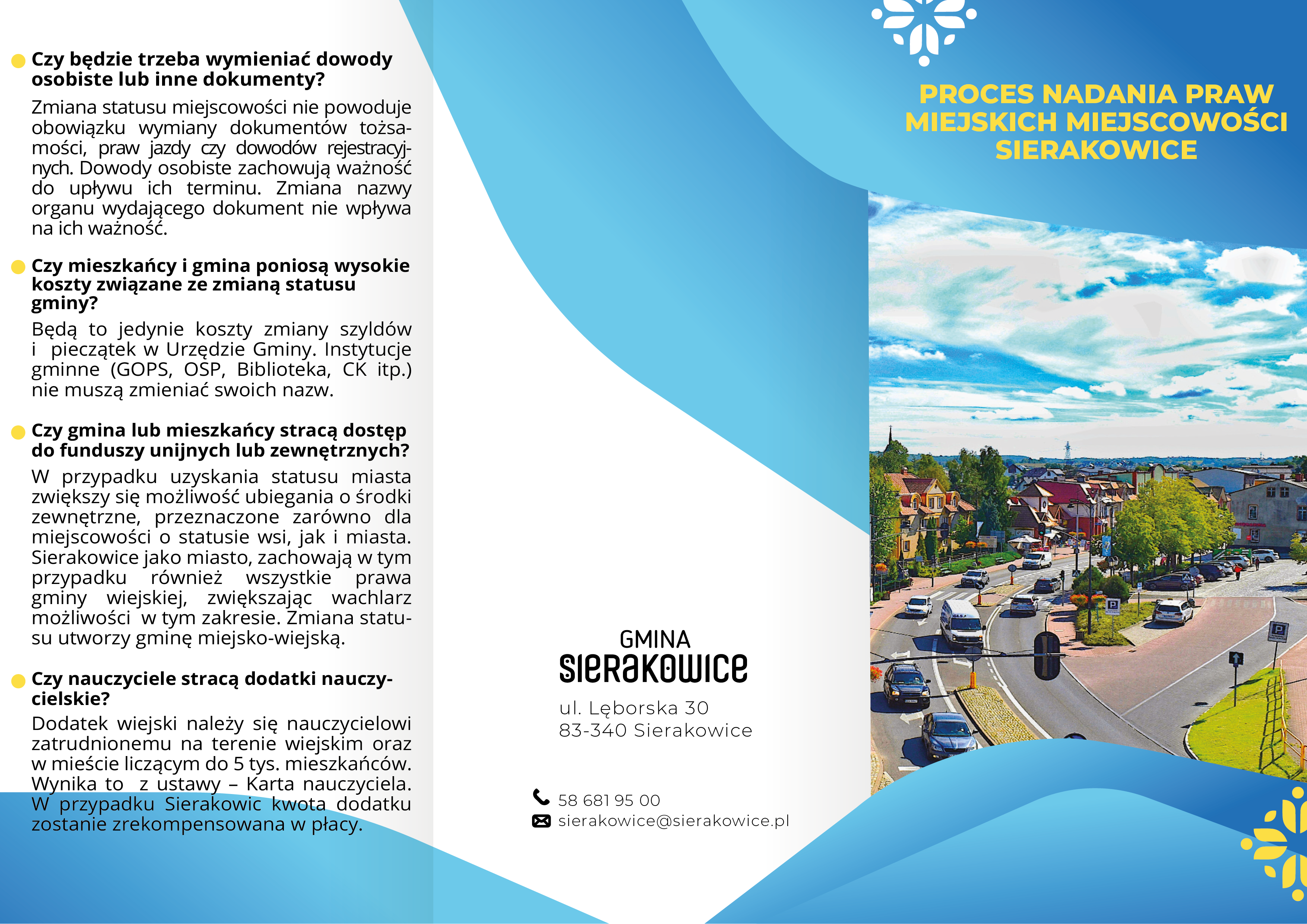 2. Udostępnienie materiałów informacyjnych związanych z nadaniem statusu miasta miejscowości Sierakowice (ulotki, materiały opisowe, plakaty) w następujący sposób: